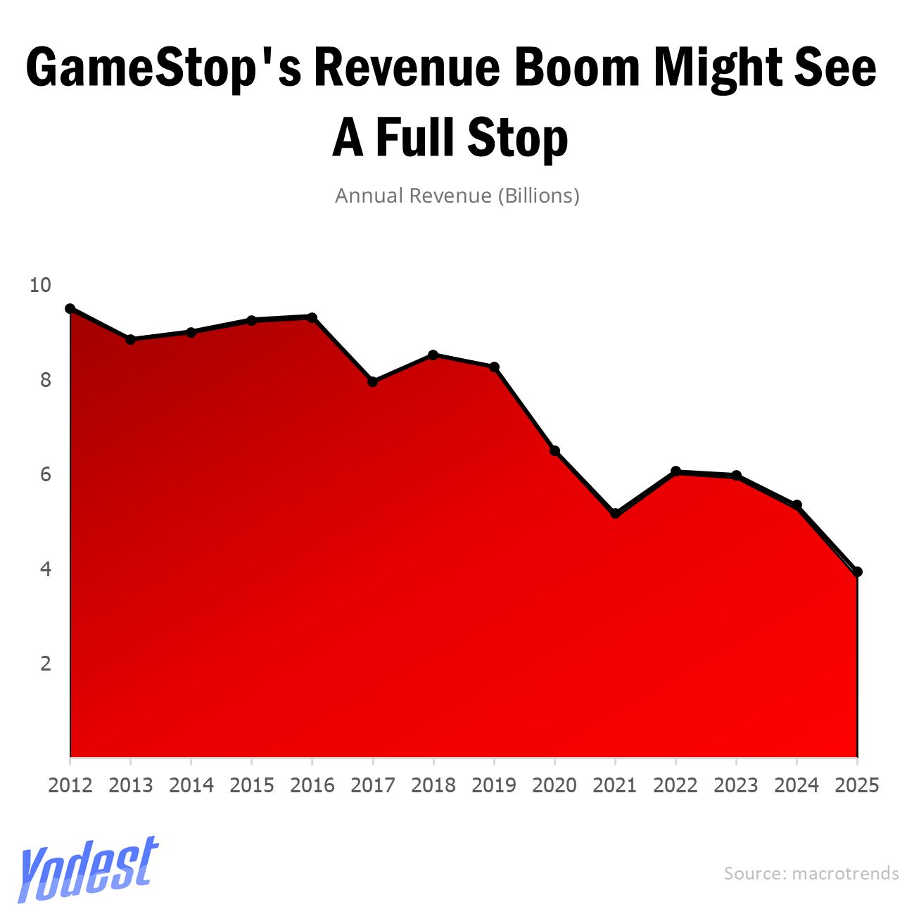 GameStop’s latest earnings show a company cutting costs hard to sustain itself, nevertheless losing ground where it matters most. The company’s slowdown is painfully evident; the annual revenue has been steadily dropping from $9,364 million in 2016 to just $3,823 million in 2025.