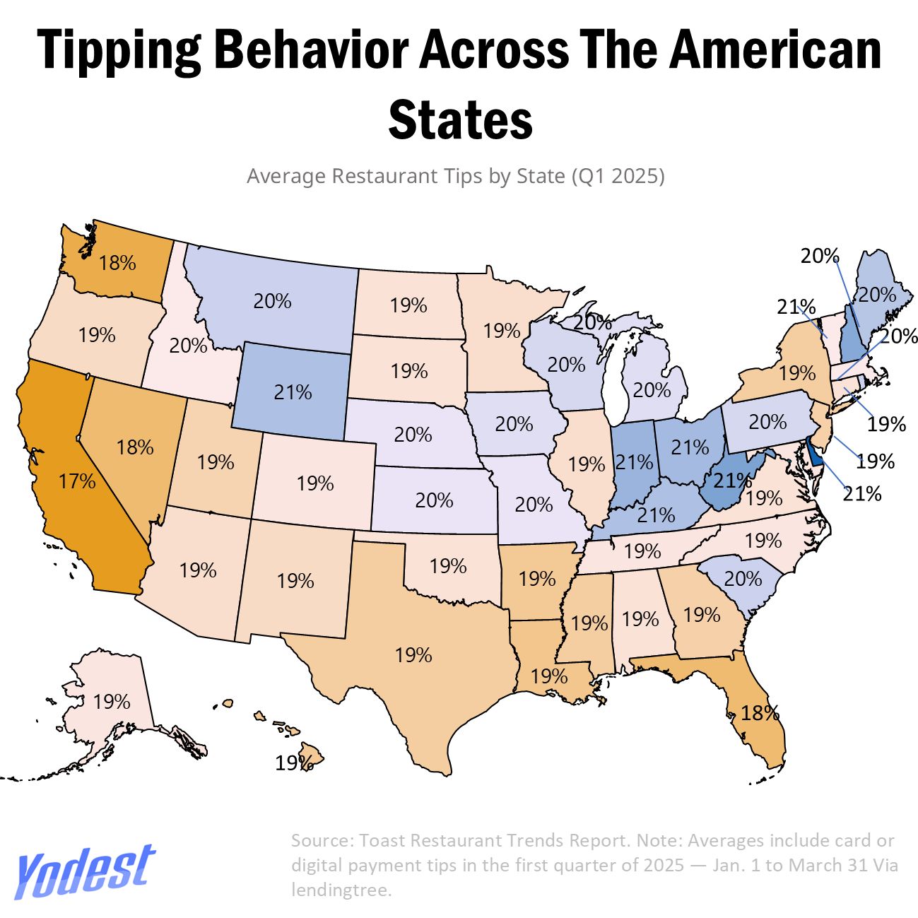 If tipping was once limited to sit-down restaurants, today it has become an expected default in 2025. The ever-present use of digital checkout screens has merged tipping prompts into nearly every quick-service counter and takeout window, fundamentally changing the entire landscape. According to the Lending Tree, average tip at full-service restaurants through card and digital tips is 19.4% nationally. The culture of tipping has proliferated; even limited-service establishments, which initially didn't bank on gratuity, now see an average tip of 15.8%. In Delaware, the combined average stands out at 22.1% while California sits at 17.3%.