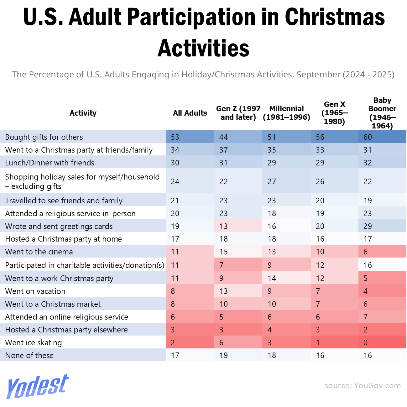 Online shopping also plays a major role. Nearly half of shoppers, or 49%, buy gifts through their mobile phones. Millennials are the most likely to shop via mobile at 60%, followed by Gen Z at 50%. In-store shopping remains relevant among older consumers. About 59% of Americans bought holiday gifts in physical stores, rising to 63% among Gen X.