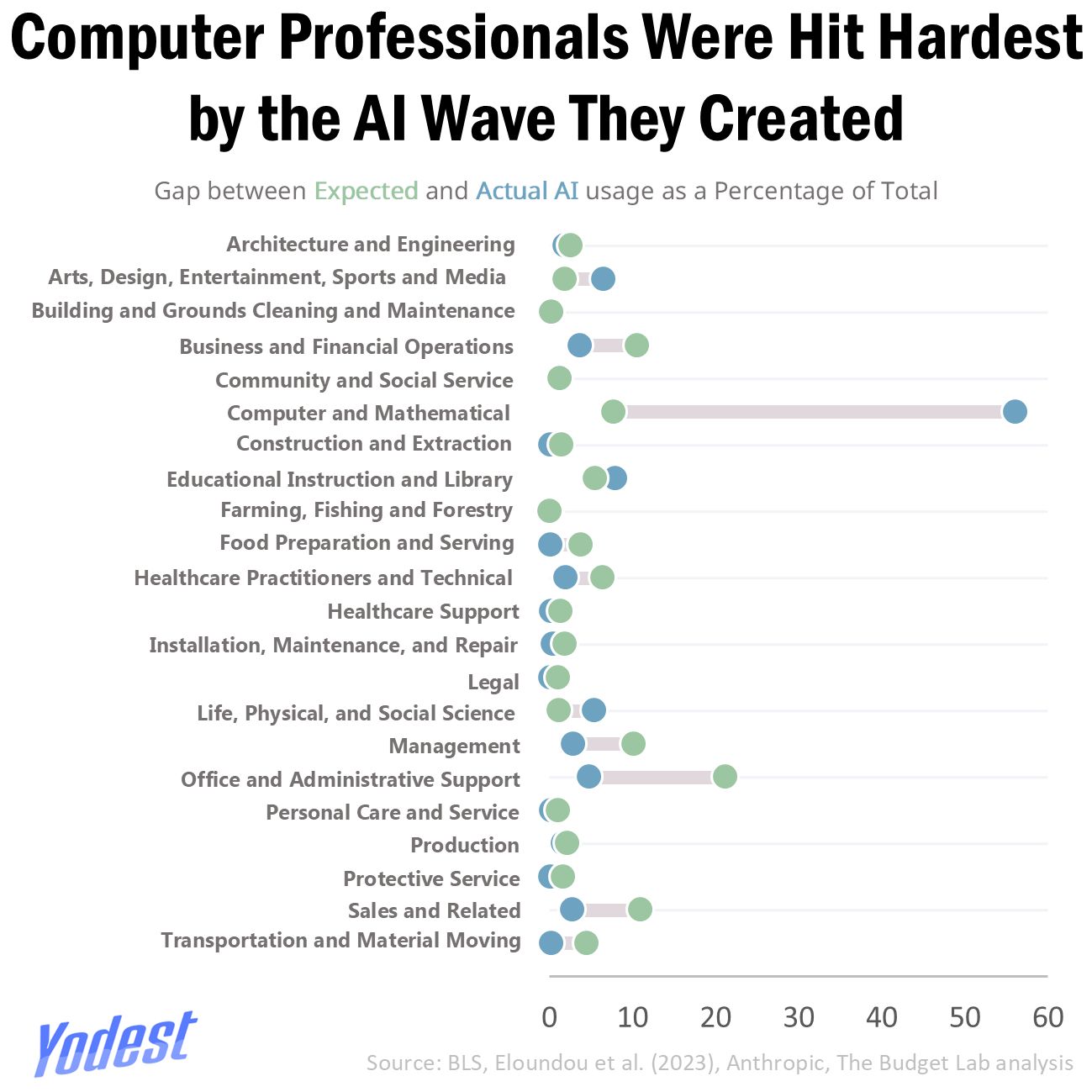 Even technical leadership isn’t exempt. Architectural and engineering managers require 47.1% human engagement, yet it stands in the face of a 25% chance of automation, showing that even strategic oversight does not come with certainty. The baseline is clear, but the caveat is baked in; safe doesn’t imply static. Workers in resilient sectors will need to double down on specific human edges like creativity, judgment, and adaptability at risk of AI automation, while physical skill may provide a moat, it’s not permanent.